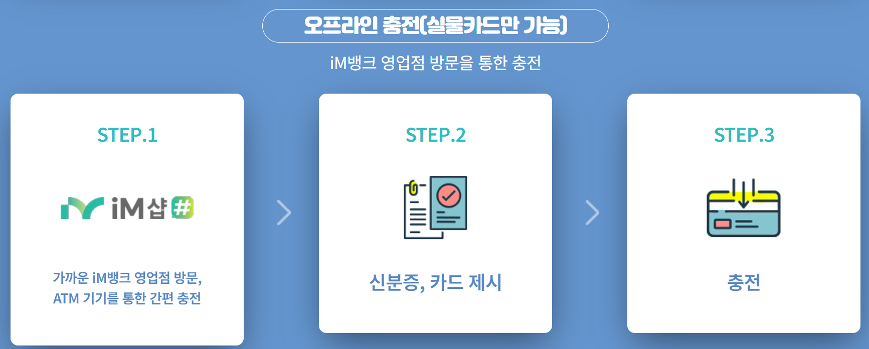 - iM뱅크 영업점 방문: 가까운 iM뱅크 영업점을 방문하여 실물 카드로 충전 가능합니다.
