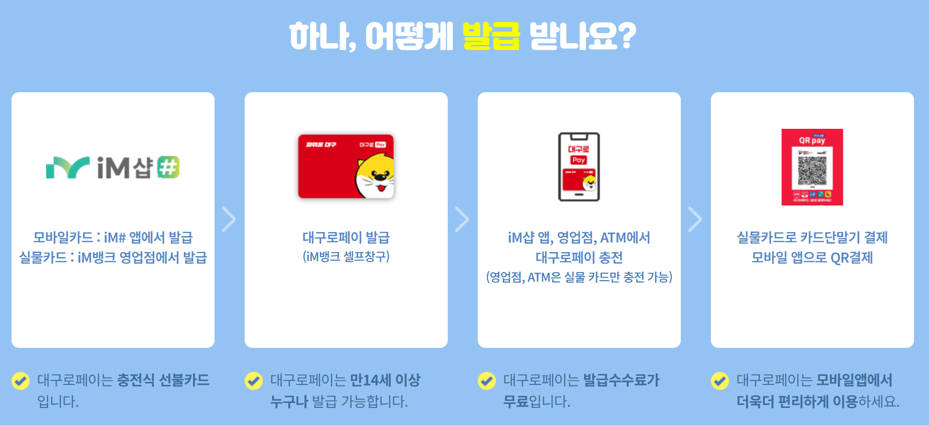 - 삼성페이 연동: 삼성페이 앱에 대구로페이 카드를 등록하여 NFC 결제 방식으로도 이용할 수 있습니다.