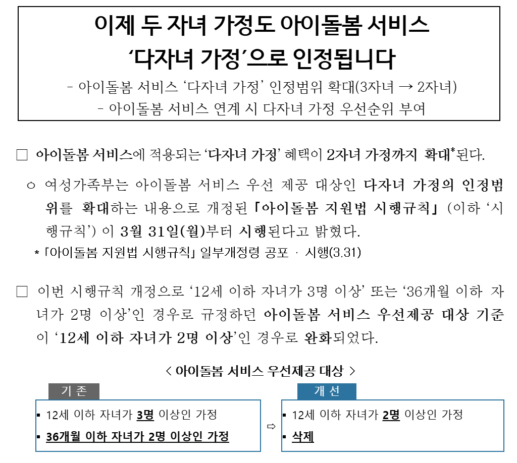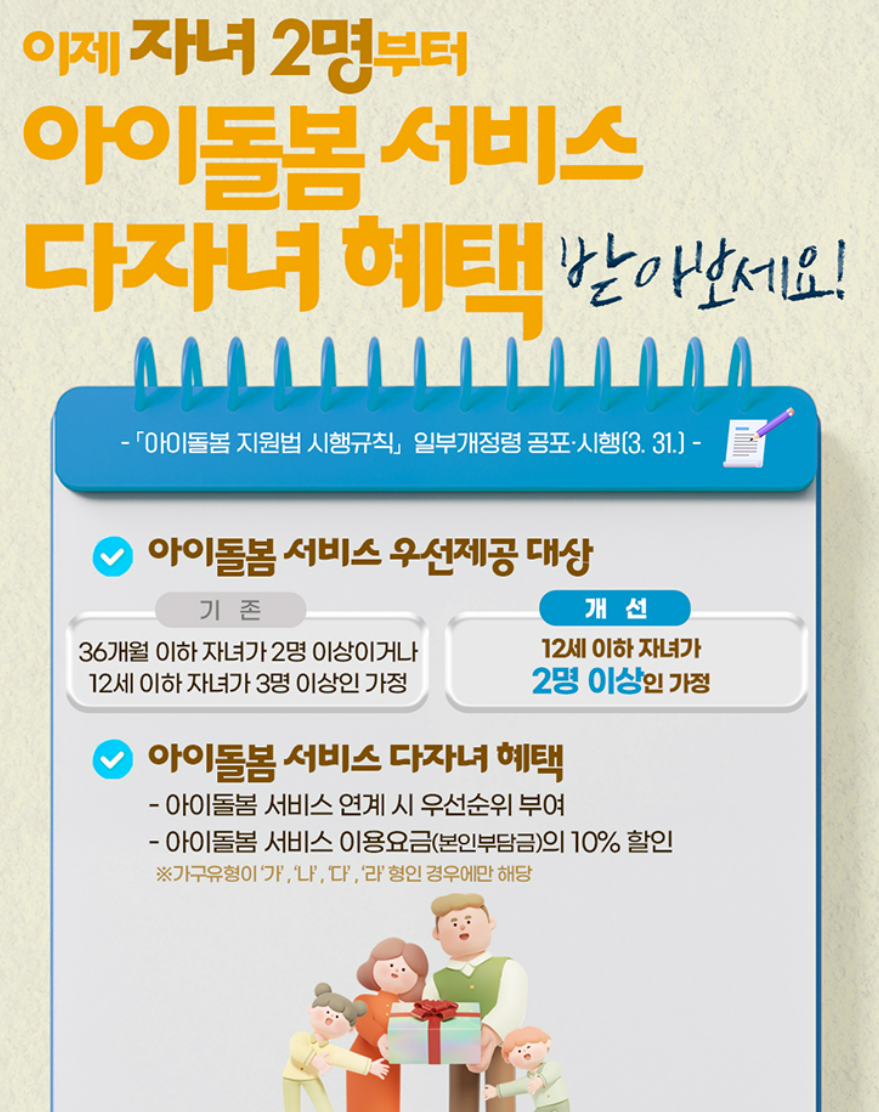 이번 개편을 통해 맞벌이·한부모 가정과 다자녀 가정(2자녀 이상)의 돌봄 공백을 최소화하는 방향으로 서비스가 제공될 예정입니다.