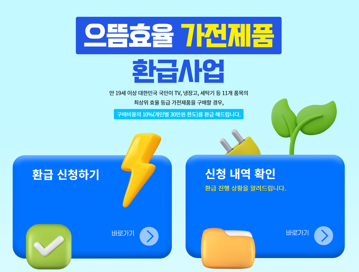 구매자가 대상 제품을 구입한 뒤 신청을 완료하면, 심사 후 10%의 금액을 본인 계좌로 입금해 줍니다. 일반 가구는 최대 20만 원, 복지할인가구는 최대 30만 원까지 환급 받을 수 있어 가전 교체에 실질적인 도움이 됩니다.