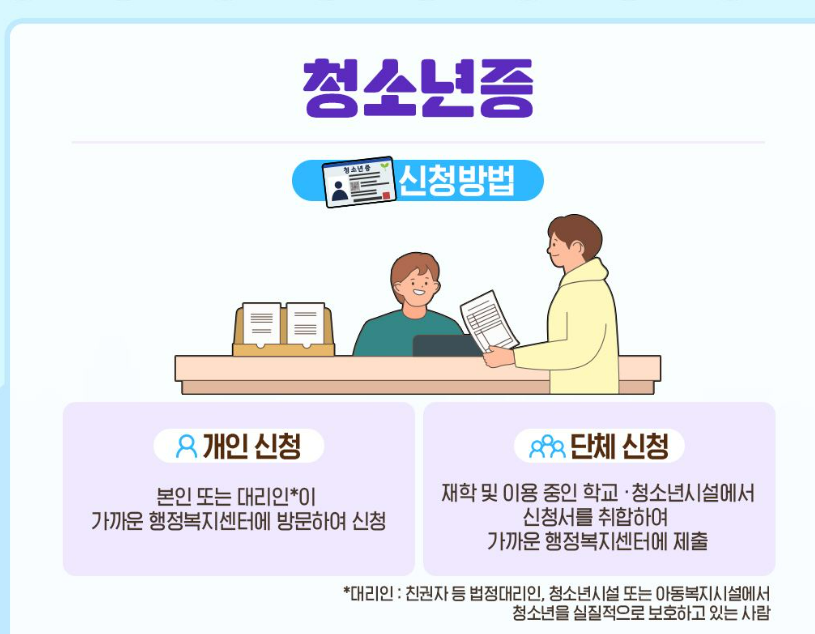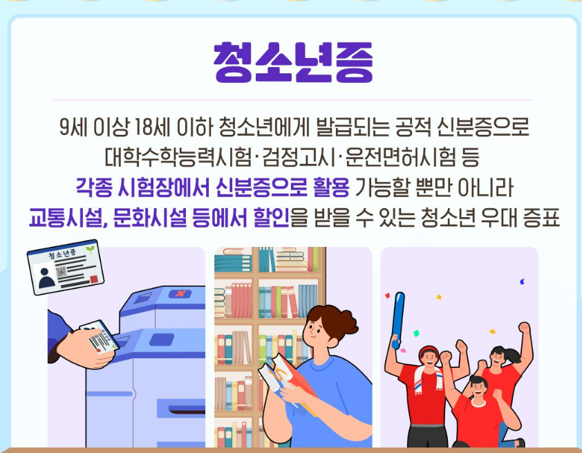 청소년증은 만 9세 이상 24세 이하의 청소년이 발급받을 수 있는 신분증으로, 청소년의 신분을 증명하고, 다양한 청소년 할인 혜택을 받을 수 있는 중요한 수단입니다. 청소년증을 소지하면 영화관, 대중교통, 박물관, 공연 등에서 할인 혜택을 받을 수 있으며, 일부 기관에서는 청소년증을 통해 전용 서비스나 프로그램에 참여할 수 있습니다.