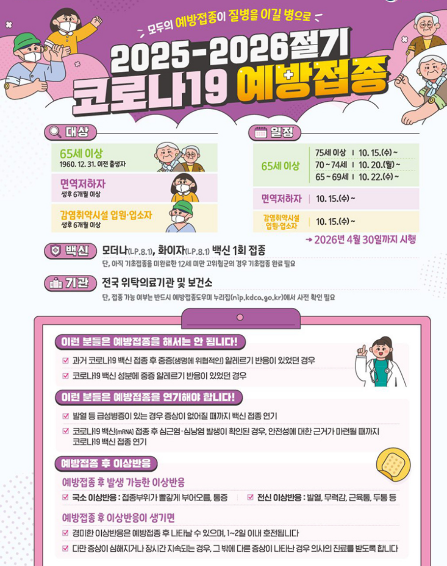고령자, 면역저하자, 요양병원·복지시설 입원·입소자 등 고위험군은 우선 접종 대상이며, 접종 일정은 연령대별로 순차적으로 안내됩니다.
