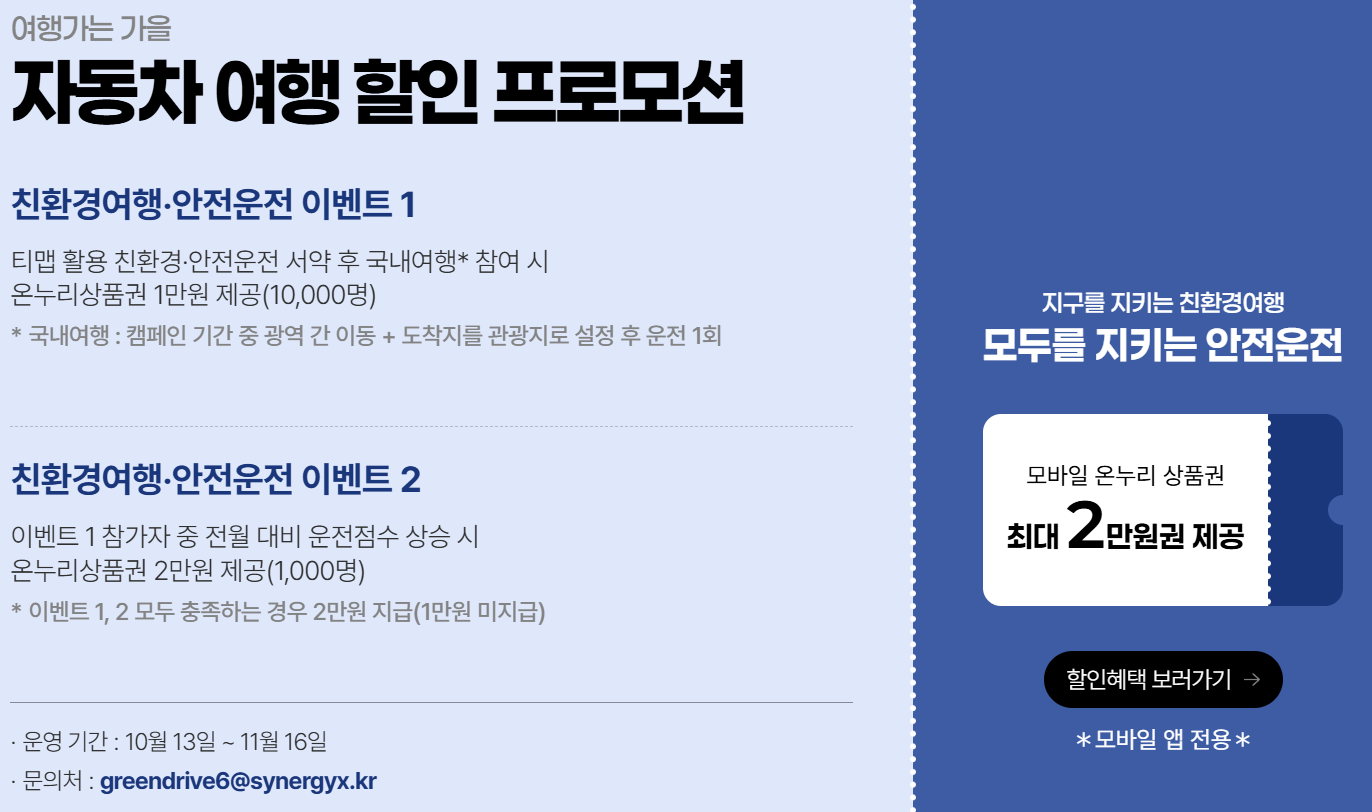 이벤트 1에 참여하려면 티맵 앱을 통해 친환경·안전 운전 서약을 완료해야 합니다. 서약 완료 후 캠페인 기간(10월 13일부터 11월 16일까지) 동안 광역 이동과 관광지 도착 기록을 남기면, 선착순 10,000명에게 온누리상품권 1만 원을 지급합니다.