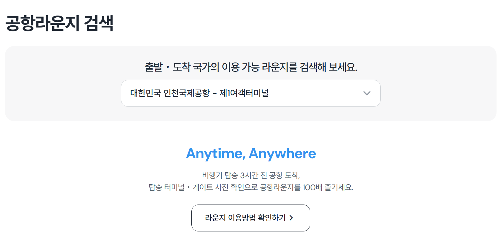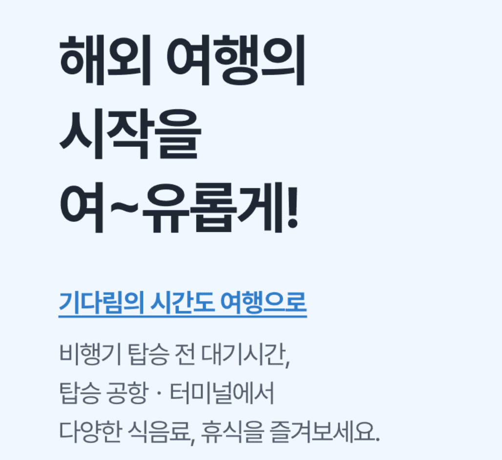 - 이용대상: 비즈니스석 또는 퍼스트클래스 이용객, 항공사 상위등급 회원(스카이패스 모닝캄 프리미엄, 아시아나 다이아몬드 이상 등)