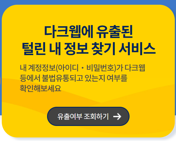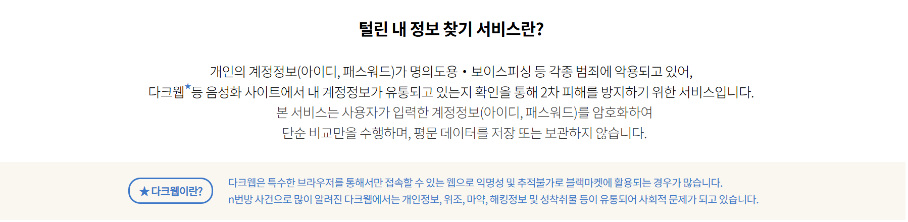 털린 내 정보 찾기는 공공기관이 운영하는 공식 서비스로, 다크웹 등에서 불법 유통된 계정 정보와 비교해 본인의 계정이 유출된 적이 있는지를 확인할 수 있게 구성되어 있습니다.
