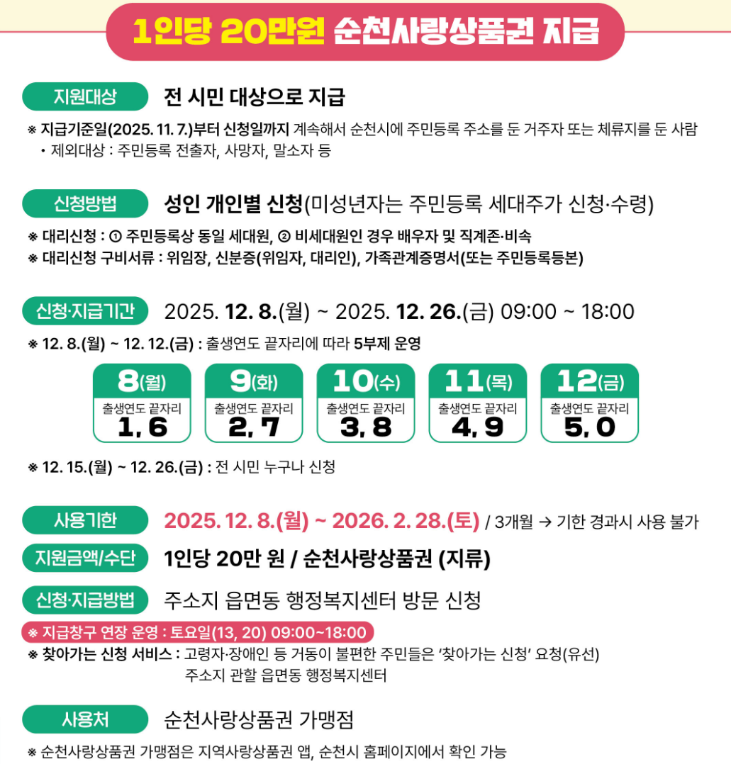 사용 기한 및 사용처: 지급된 상품권은 2025년 12월 8일부터 2026년 2월 28일까지 사용 가능하며, 순천사랑상품권 가맹점 약 1만 3,840곳(전통시장, 동네마트, 식당, 카페, 미용실, 읍면 지역 하나로마트 포함)에서 사용이 가능합니다.
