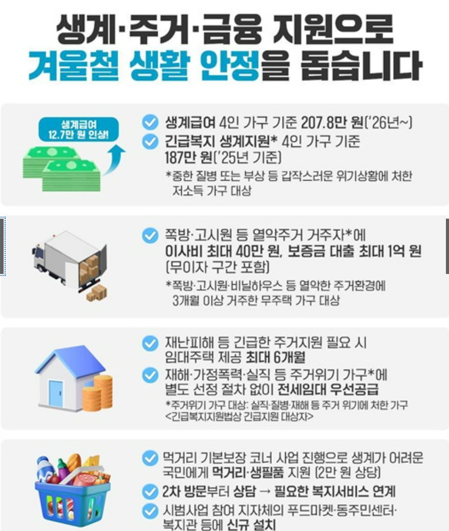 특히 저소득층이나 취약계층, 다자녀 가구, 노인‧영유아‧장애인 포함 가구 등은 지원 대상일 가능성이 높습니다. 만약 조금이라도 해당 조건에 부합한다면, 지금 바로 관할 행정복지센터나 복지 포털에서 신청해 보시기 바랍니다.