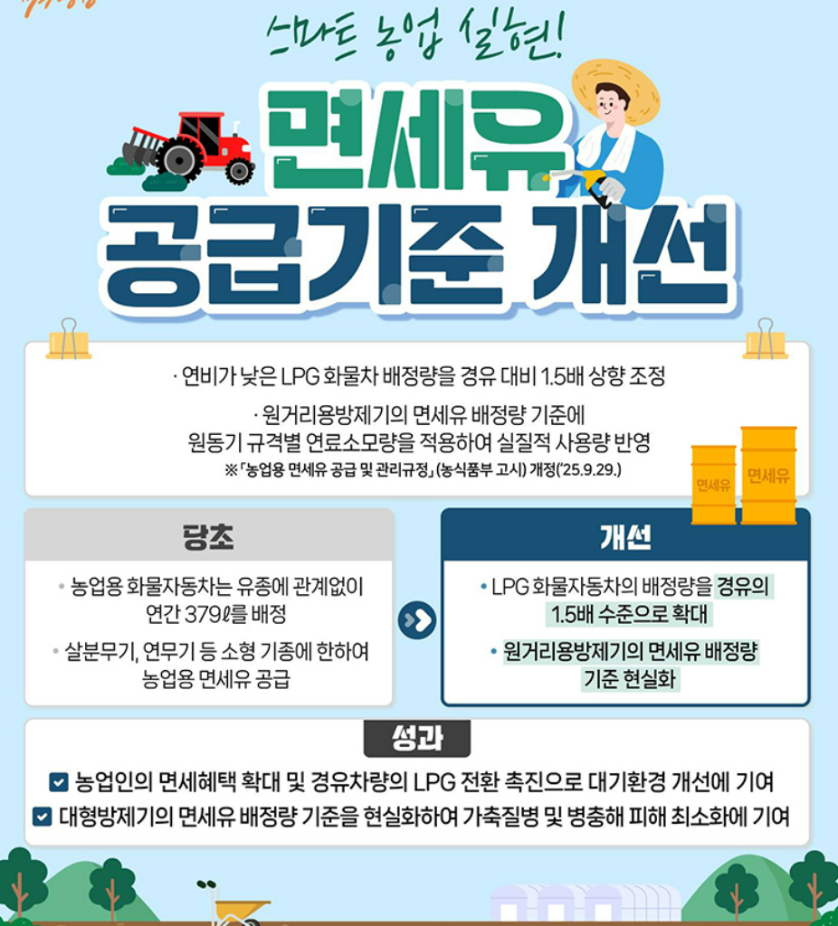 면세유 공급기준 개선은 농업인의 실제 작업 환경을 반영하고 친환경 농업 전환까지 도모하는 현실적이고 전략적인 정책 변화입니다.