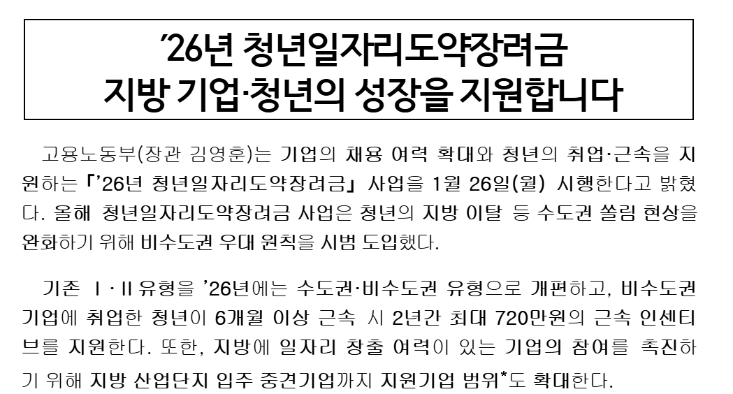 특히 2026년에는 비수도권 중심 지원이 강화되어 지방 취업을 고민하는 청년과 인재 확보에 어려움을 겪는 지역 기업 모두에게 실질적인 도움이 되는 제도입니다. 취업을 준비 중인 청년이나 청년 채용을 고려 중인 기업이라면, 이 제도를 적극적으로 활용해 보시기 바랍니다.