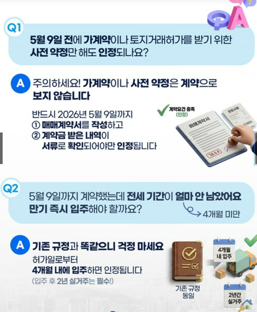 - 2026년 5월 9일까지 계약 체결분 → 기존 유예 적용 가능