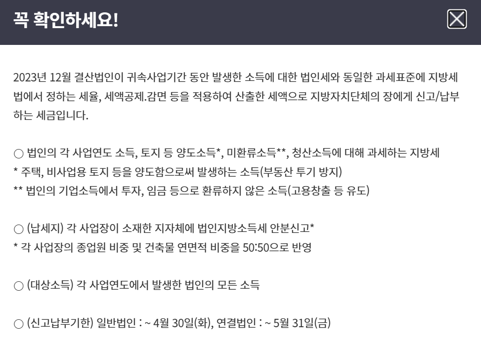 법인세 신고와 마찬가지로, 대부분의 법인은 12월 결산법인이므로 매년 4월 1일부터 4월 30일까지 법인지방소득세도 함께 신고·납부해야 합니다.
