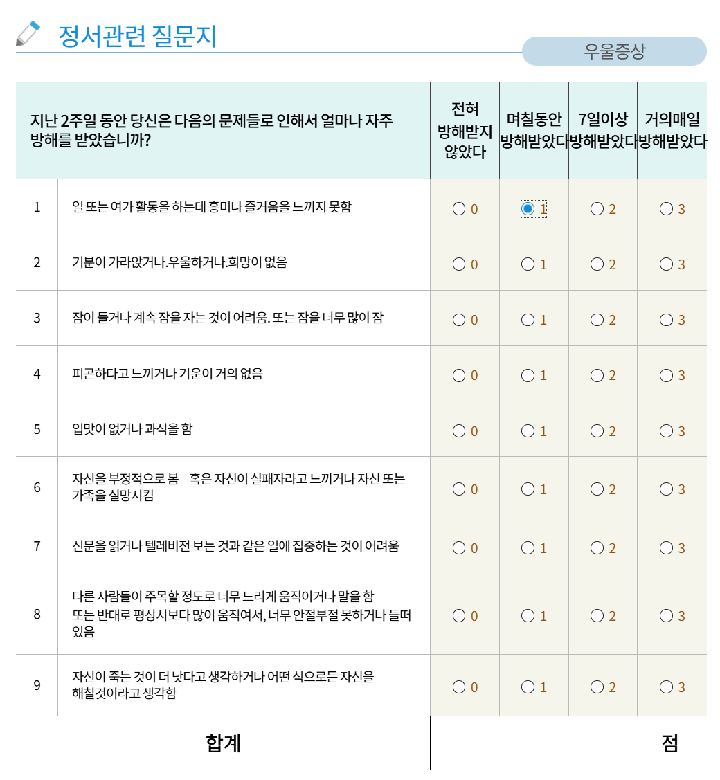 이 중 ‘우울증’을 선택하면, 바로 간단한 문항들이 나타납니다.