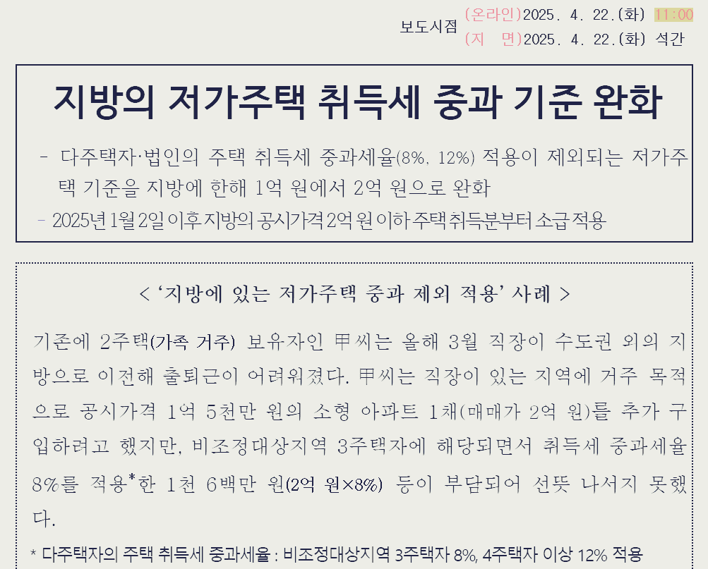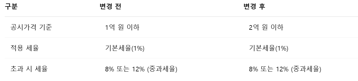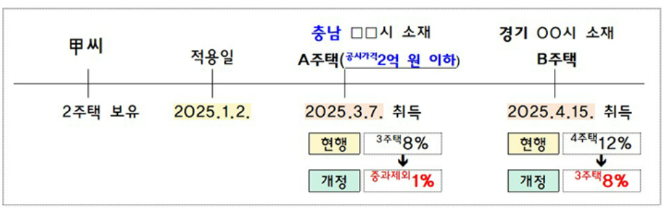 - 소급 적용: 시행일 이후 취득한 주택 중, 공시가격이 2억 원 이하인 경우에는 개정된 기준이 적용됨