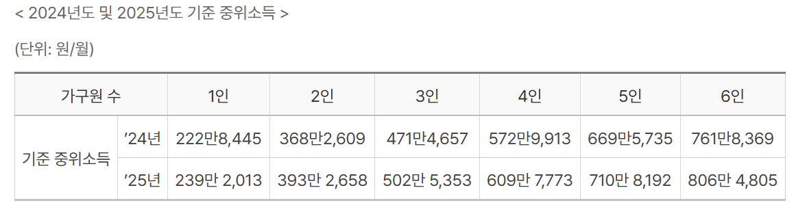 * 2025년 차상위 계층 소득 기준은 기준 중위소득의 50% 이하입니다. 1인가구 기준 중위소득 50%는 1,196,007원이며, 2인가구는 1,966,329원입니다