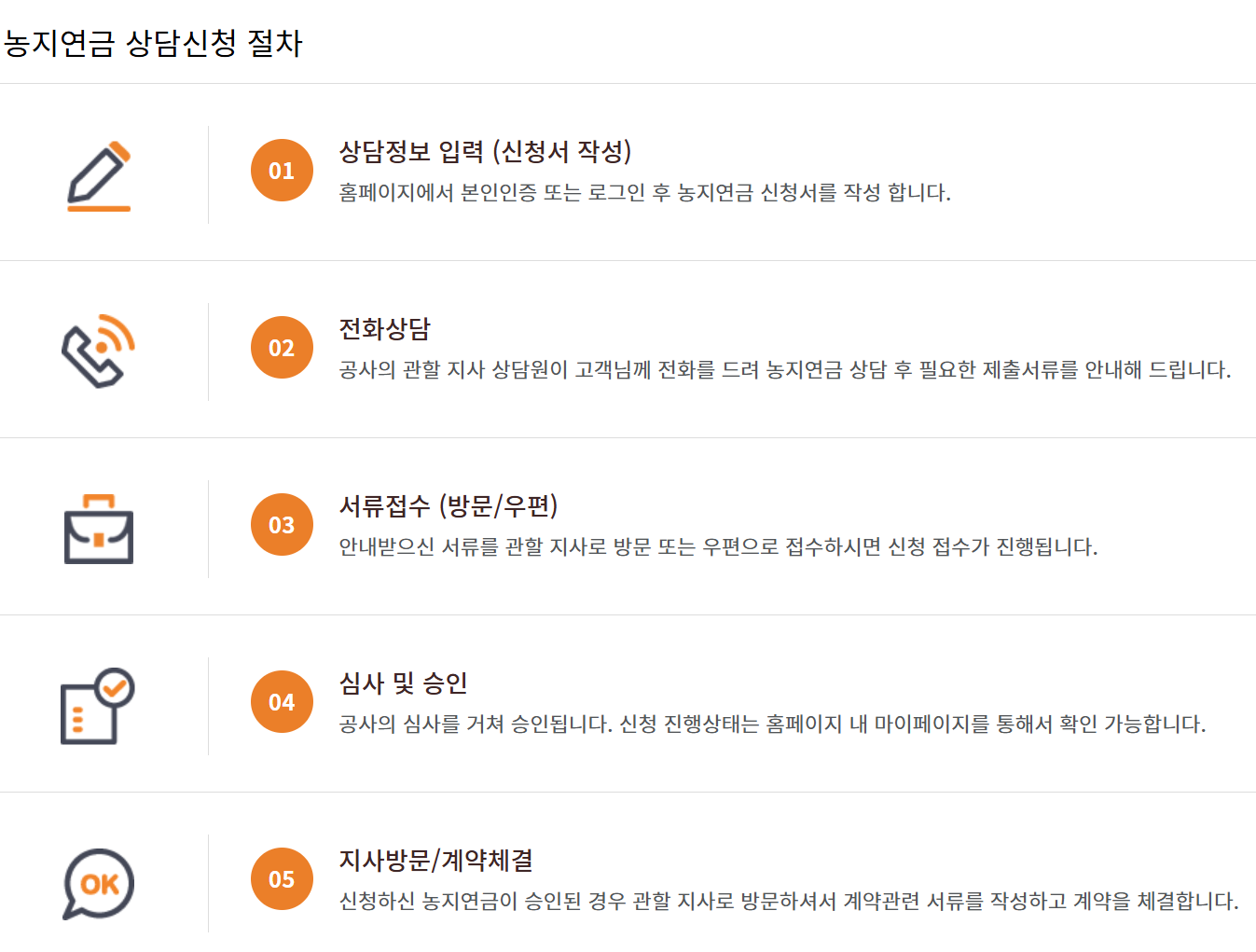 지금까지 농지연금 가입조건에 대해 자세히 알아보았습니다. 이제 어떻게 신청하면 될지 신청절차를 알아보겠습니다.