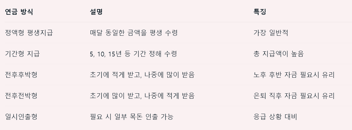 농지연금 수령방식은 종류별로 선택이 가능합니다. 아래의 표로 간단하게 설명드리겠습니다.