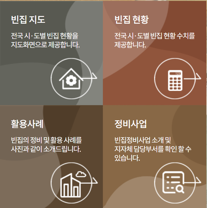 빈집 정보센터 빈집애 누리집은 크게 다섯 가지 핵심 기능을 중심으로 구성되어 있으므로 필요한 정보를 얻을 수 있도록 바로 확인해주세요.
