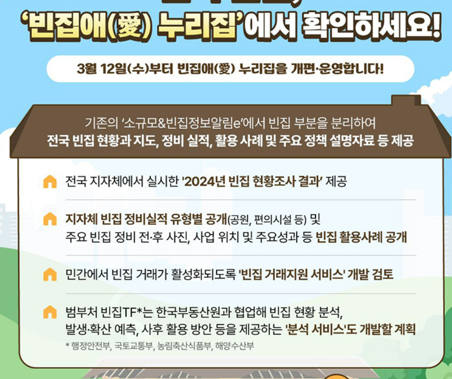 '빈집애 누리집'은 전국의 빈집 정보를 통합 관리하고 국민에게 공개하는 온라인 서비스로, 기존의 '소규모주택정비 및 빈집정보 알림e' 플랫폼을 개편하여 2025년 3월 12일부터 새롭게 운영되고 있으니 빈집 정보센터가 궁금하신 분들은 꼭 확인해주세요!
