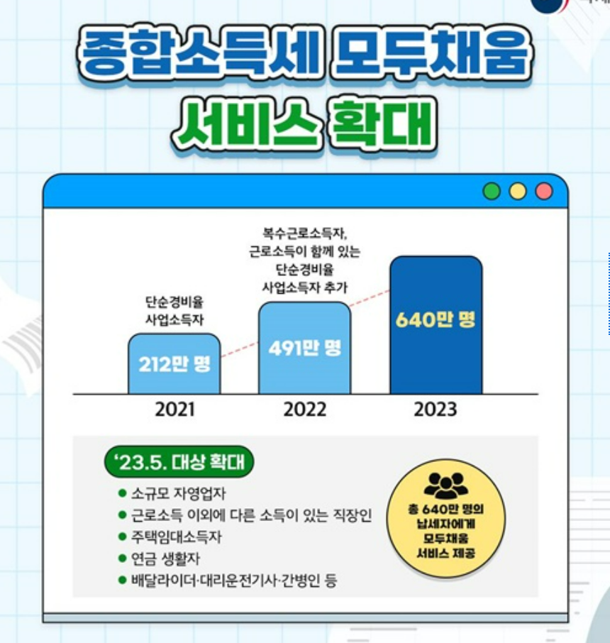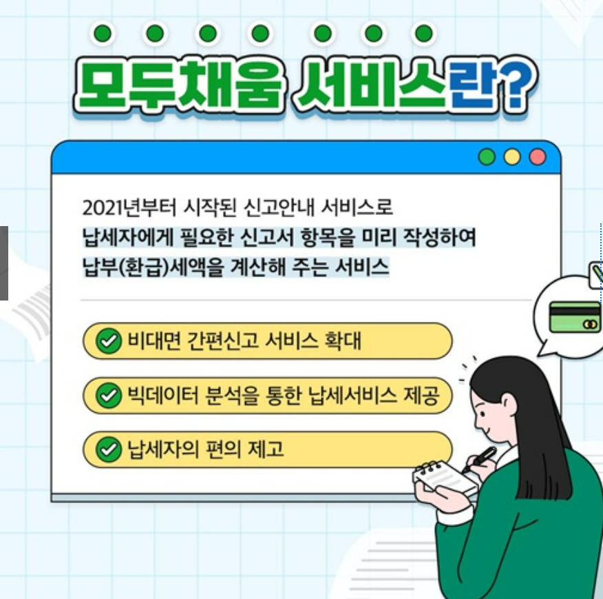 그러나 세무에 익숙하지 않은 많은 국민에게는 매년 반복되는 세금신고가 여전히 어렵고 부담스러운 일일 수 있습니다. 이런 국민들의 편의를 돕기 위해 국세청에서는 ‘모두채움신고’라는 제도를 운영하고 있습니다.