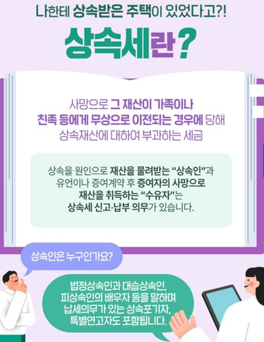 상속세는 사망한 사람(피상속인)의 재산을 법정상속인 또는 유언에 따라 상속받는 경우, 상속받는 사람(상속인)에게 부과되는 세금이므로 모든 분들이 꼭 미리 확인하셔야 합니다.