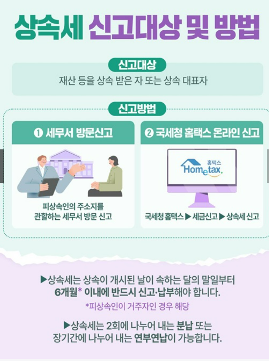 - 상속개시일(사망일) 기준 6개월 이내 신고 및 납부