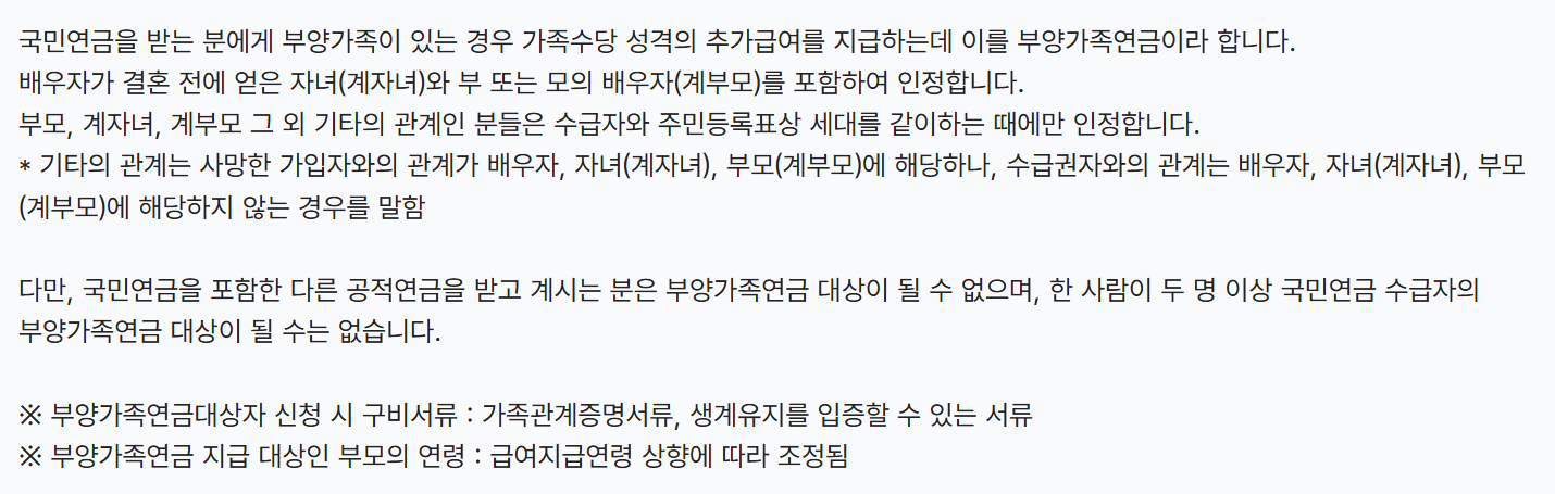가족이 국민연금 또는 타 공적연금(공무원연금, 사학연금 등)을 수급 중이면 제외됩니다.