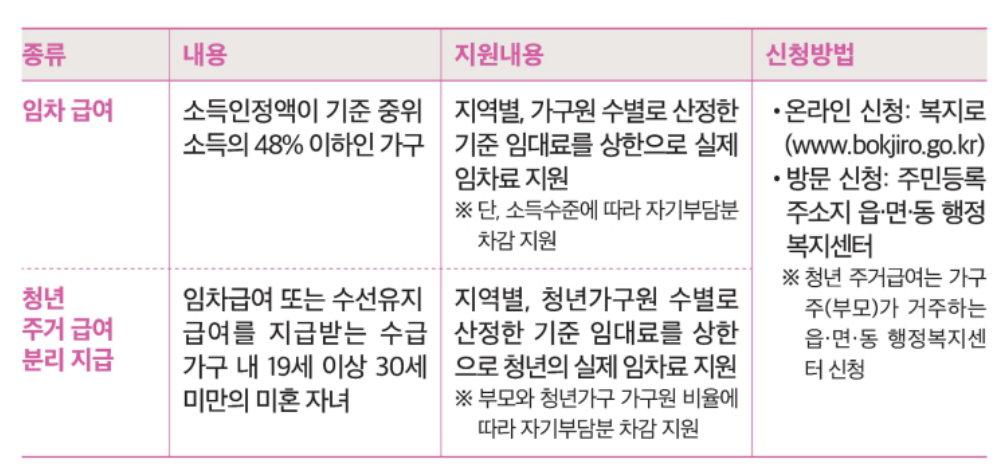 | 임차가구 | 매월 임대료를 보조 (기준임대료 내에서 차등 지급) |