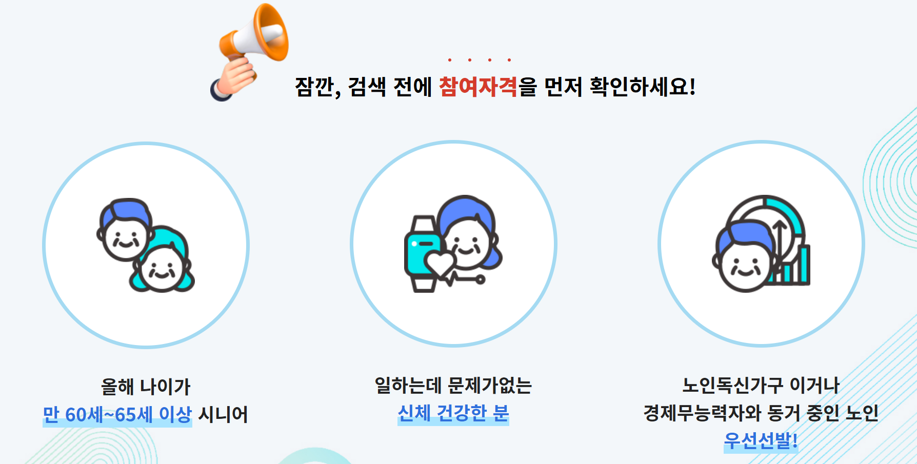 노인일자리에 참여하기 위해서는 기본적으로 아래와 같은 자격 요건을 필수로 갖추어야 하며 지금 바로 그 자격요건에 대해 하나하나 자세히 알아보겠습니다. 바로 확인해주세요!