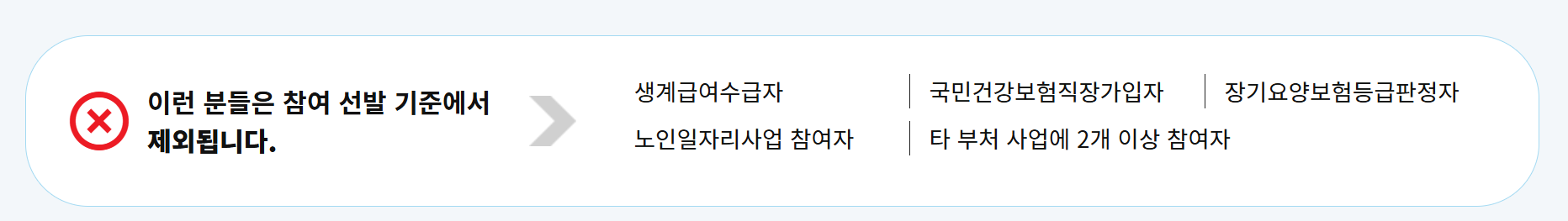 노인일자리 사업은 근로 또는 활동이 가능한 분을 대상으로 합니다. 따라서 일상생활에 지장이 없는 신체적, 정신적 건강을 유지하고 있어야 하며, 장기요양 등급(1~5등급, 인지지원등급) 대상자는 참여가 제한됩니다.