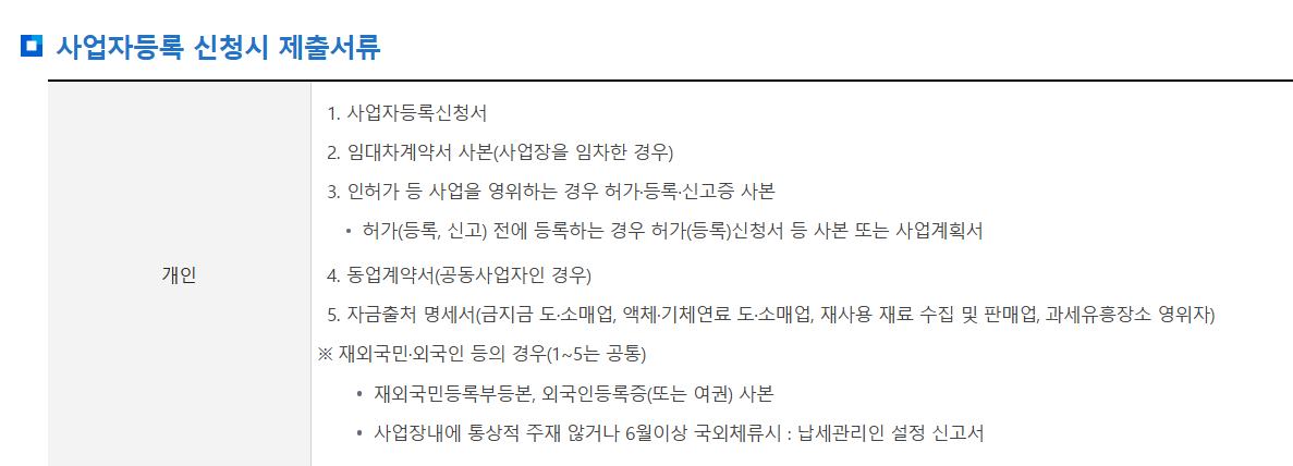 개인사업자의 경우 사업자등록 과정이 비교적 간단하지만, 사업장 형태나 업종에 따라 추가서류가 요구될 수 있으며 공통서류 및 사업장 형태에 따른 추가서류는 다음에서 바로 확인할 수 있습니다.