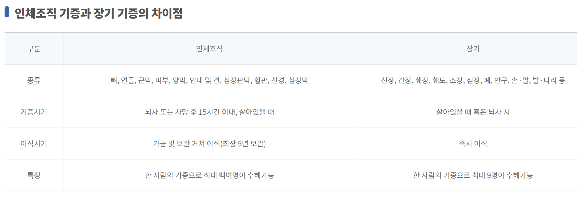 - 생전 기증 가능 장기: 신장, 간 일부, 혈액, 골수 등